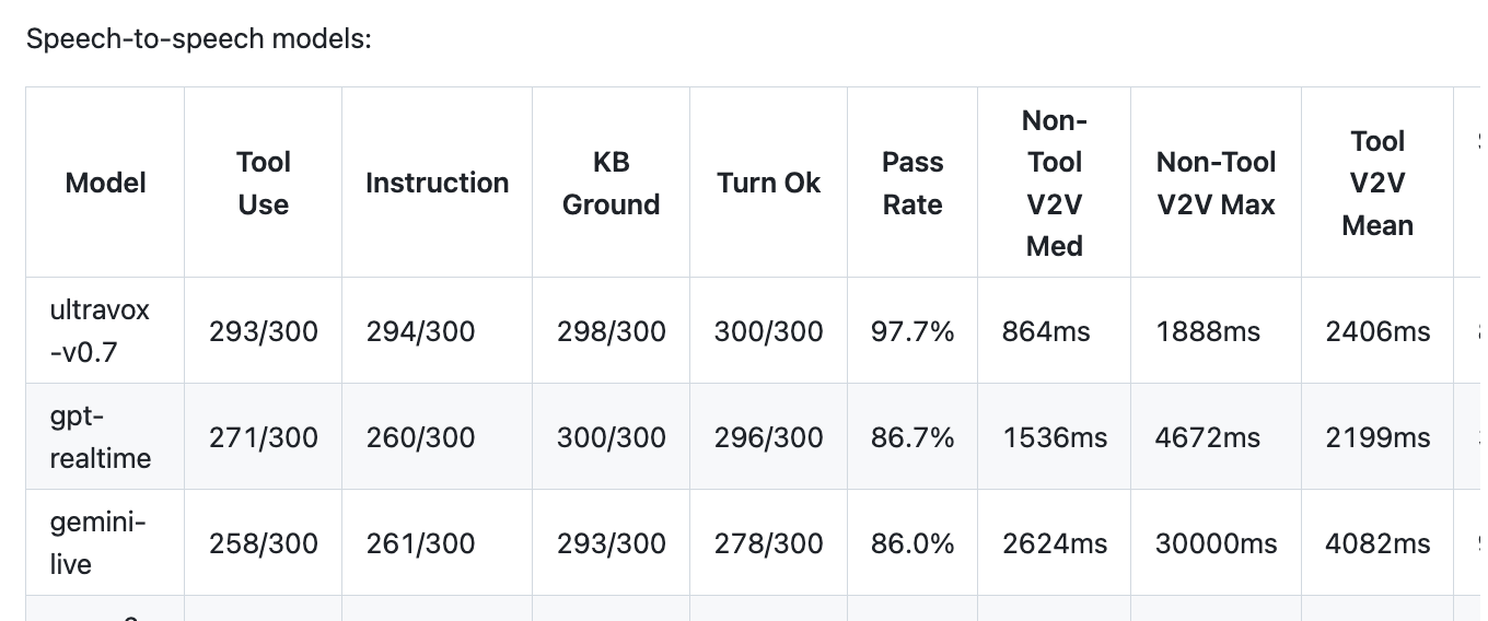 Ultravox 0.7 is the first speech-to-speech model that performs well on this kind of long, multi-turn benchmark. Congratulations to the Ultravox team for this truly impressive achievement. Ultravox has set the bar at a new level for speech-to-speech models.