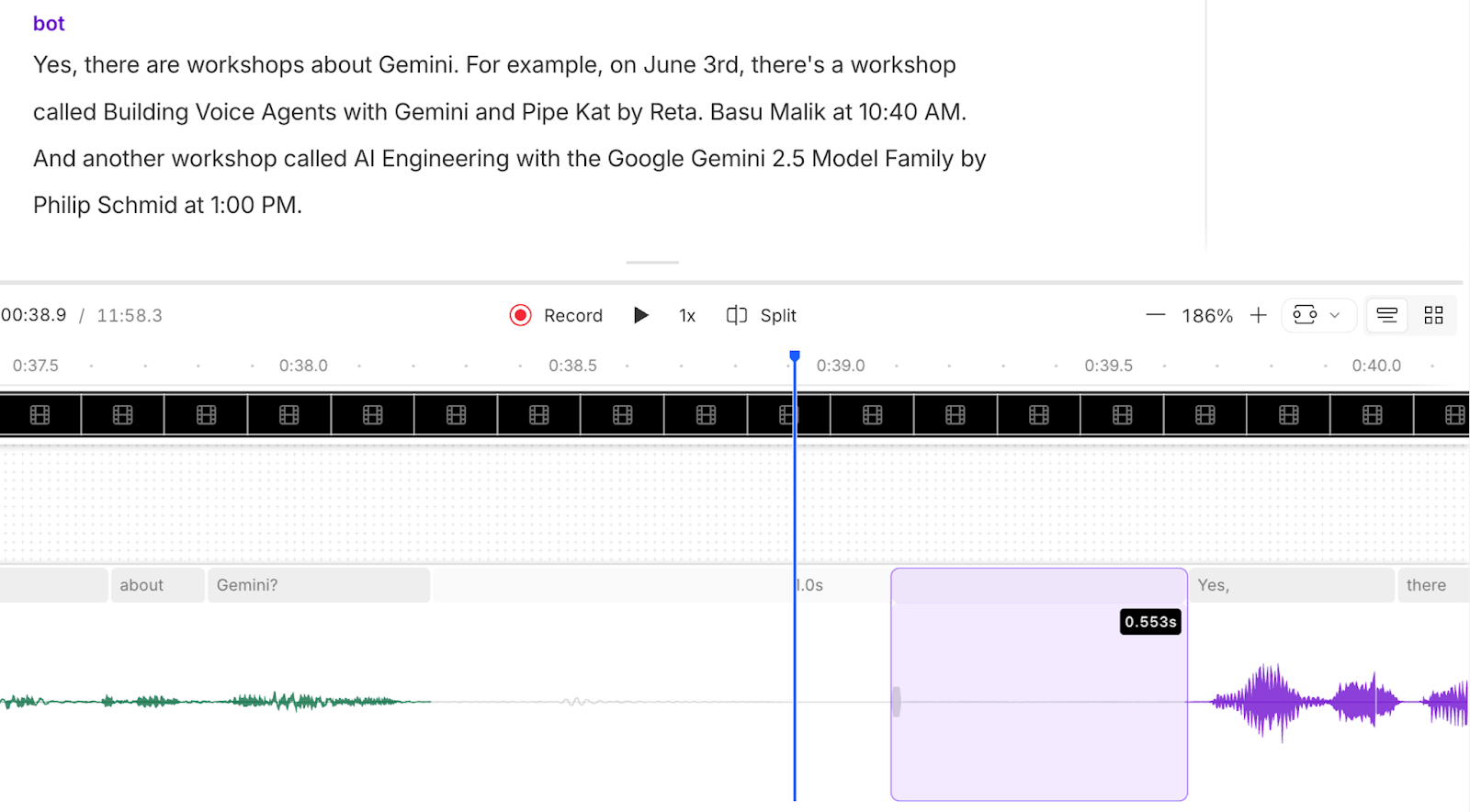 For speech-to-speech models, measuring latency is more complicated. We need to measure from the end of the user speech segment to the first moments of speech emitted by the model. For this benchmark, we record the audio of each test with the “user” input speech in the left audio track and the LLM output speech in the right track. Then we mark the start and end of all the speech segments in both tracks, pair up the segments, and measure the voice-to-voice latency.