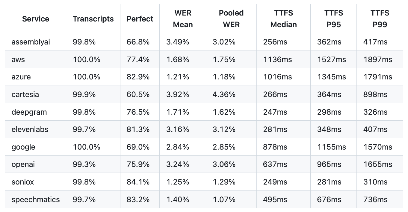 - Point-in-time: STT services update their models frequently. These results reflect a specific moment. We plan to re-run periodically and track changes.