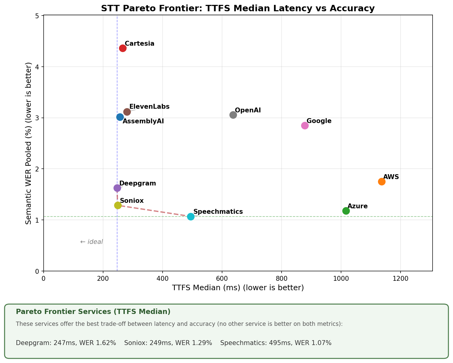 Services on the Pareto frontier offer the best trade-off between latency and accuracy. No other service is better on both metrics. The "ideal" corner is bottom-left: fastest and most accurate.