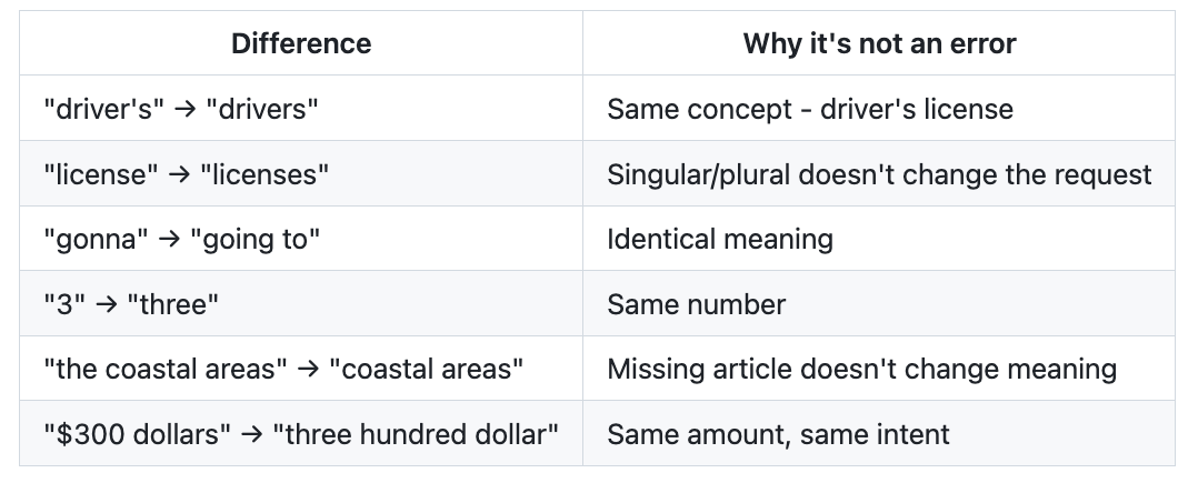 But in a voice agent pipeline, the transcript isn't the end product-it's input to an LLM. And LLMs are remarkably good at understanding natural language variations. Contractions, filler words, minor grammatical differences, number formats; an LLM handles all of these without issue. It will respond identically to "I'm gonna need 3 tickets" and "I am going to need three tickets." From the LLM's perspective, those are the same request.