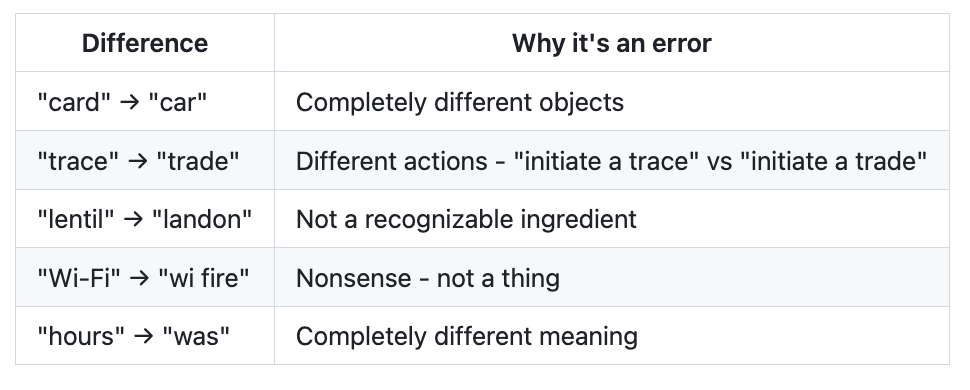 "Renew" to "review" - that's a real error. Both are plausible requests, but an LLM would take a completely different action for each. This is the kind of error that matters.