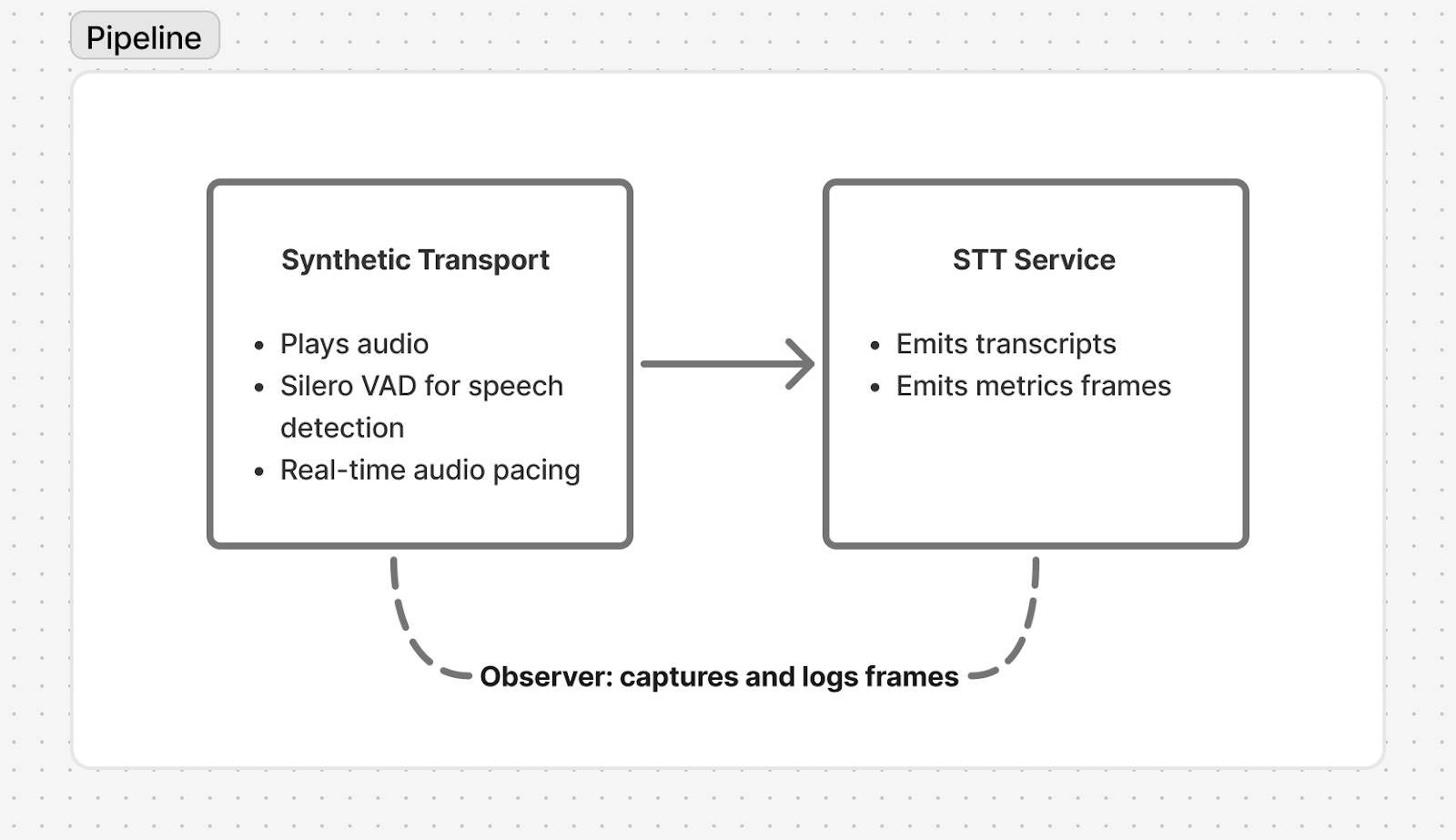 The Synthetic Transport plays pre-recorded PCM audio through the pipeline at realtime pace - 20ms chunks at 16kHz, exactly as a live microphone would deliver them. It uses Silero VAD to detect speech boundaries, emitting the same start/stop speaking events that a real transport would.
