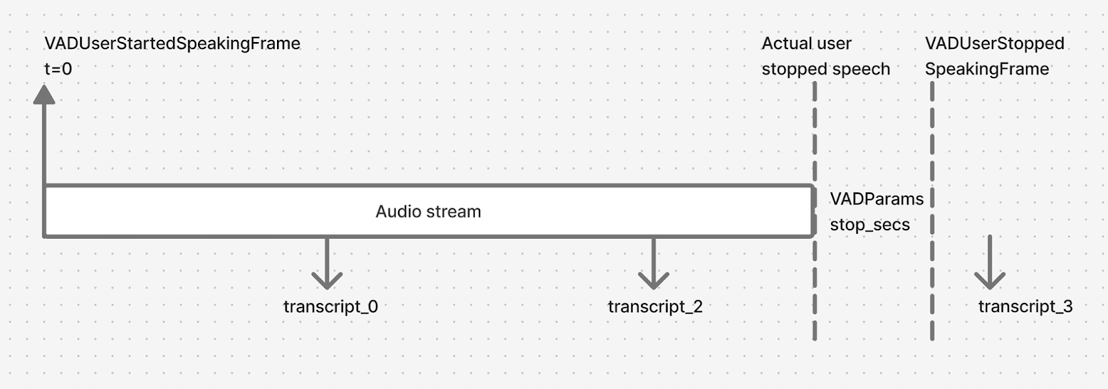 The time difference between the receipt of the last transcript and the time at which the user stopped speaking is the TTFS—the latency between the user’s final utterance and the last transcript from that utterance.
