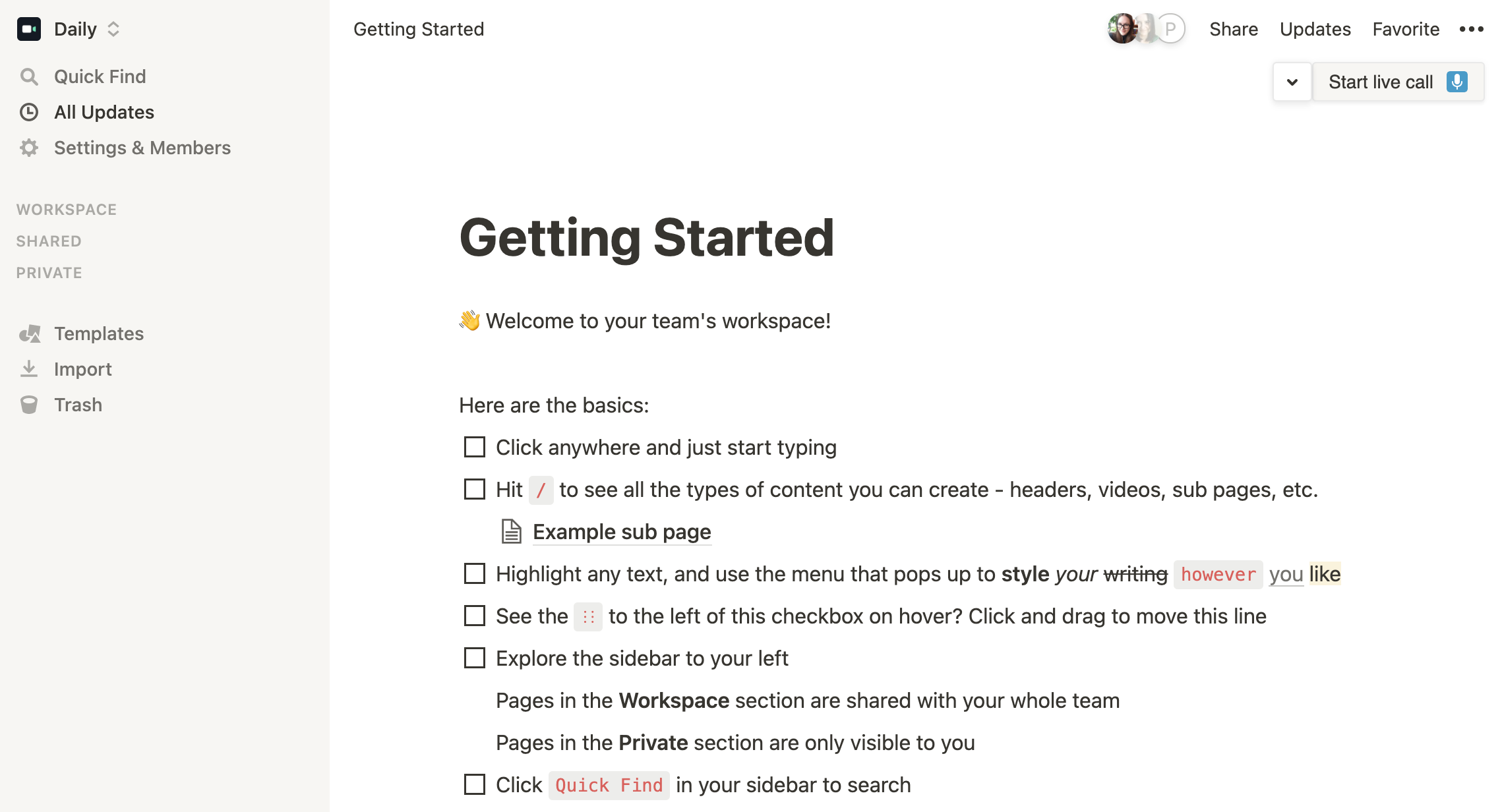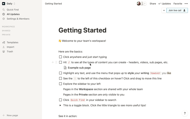 - Quickly clarify the details of a project while you and your colleague(s) are looking at the same Notion document.
