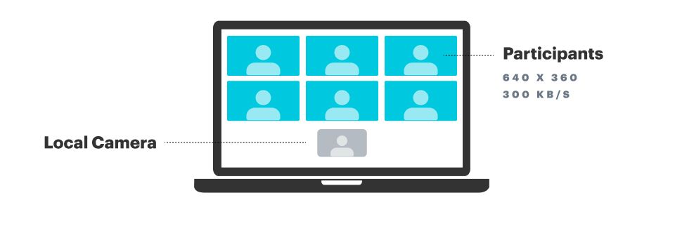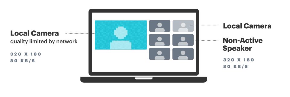 We'd like to display the active speaker at high resolution. Ideally, the video stream at this resolution would take up about 700 kbits/second. The local participant camera view doesn't take up any network bandwidth (we're just displaying the local camera feed). The other five video tiles are quite small, and 80 kbits/second is enough to deliver acceptable quality at a small display size.