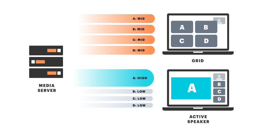 SFUs enable clients to choose which streams to receive (and to switch between different streams quickly). Giving clients control over stream selection is an important building block for bandwidth and quality management. It's also important for implementing features like breakout rooms, active and passive participant roles, and switching between active speaker and grid-layout user interfaces.