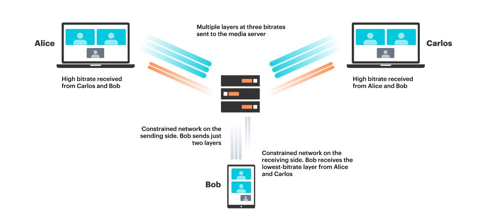 - Send multiple video streams, at different quality levels, and allow slower participants to receive a lower-bitrate stream when necessary. This is simulcast.