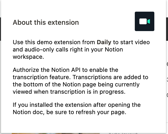 "description": "Use the Daily API to embed and transcribe video calls directly in your Notion workspace.",