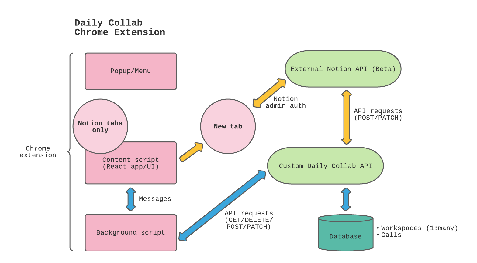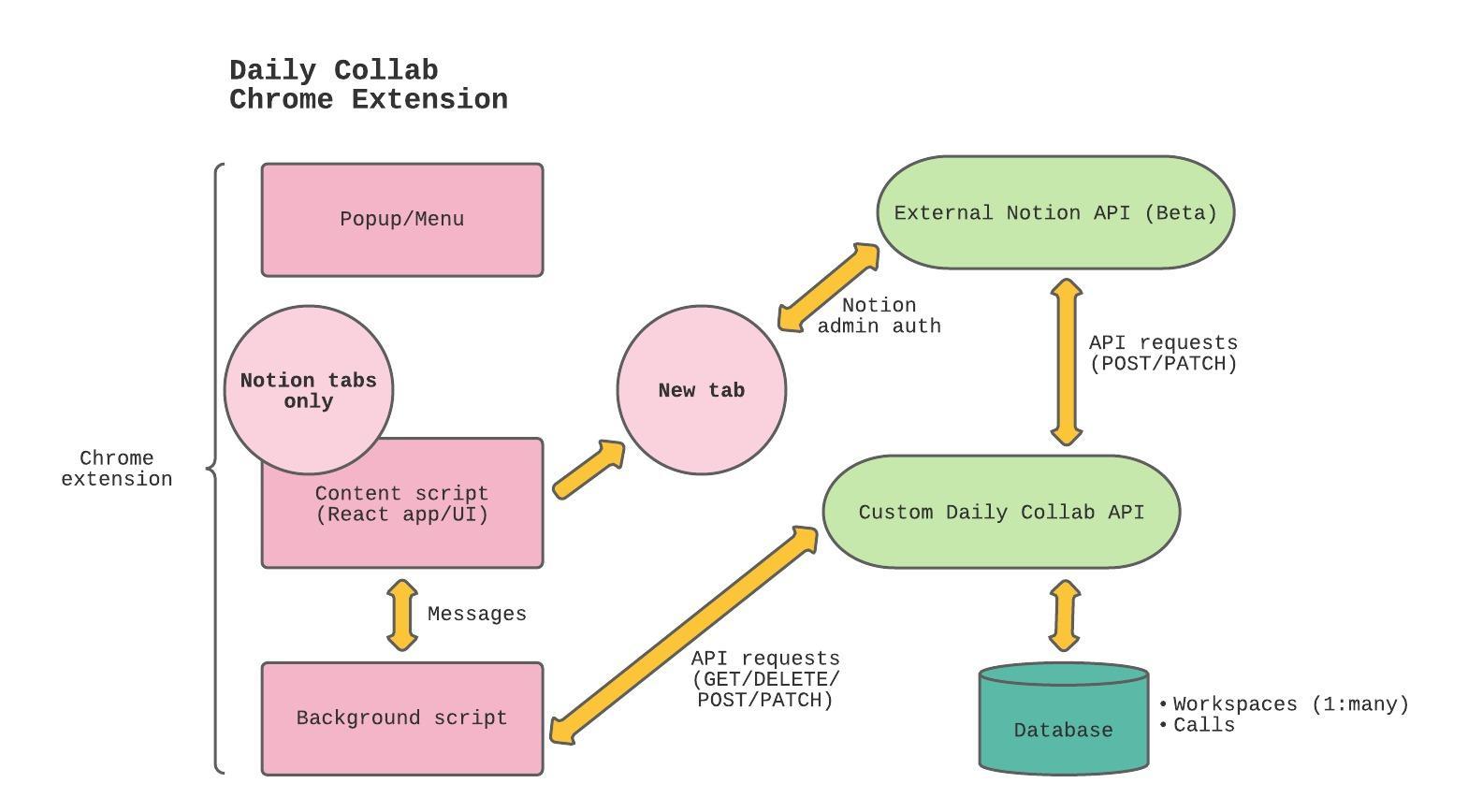 manifest.jsonfile. In Daily Collab’s case, it’s anything that matcheshttps://www.notion.so/*, with a couple exclusions. - The content script communicates with the background script to make external API calls and take other “behind the scenes” actions.