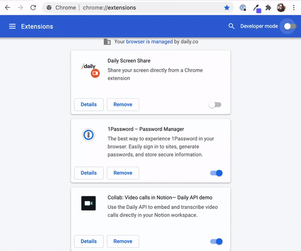 Daily built the Daily Collab Chrome extension demo to showcase a new example of how quickly you can jump into a video call from any webpage. With Daily Collab, you can start an audio or video call from any Notion page and transcribe the audio from the call directly into that page.