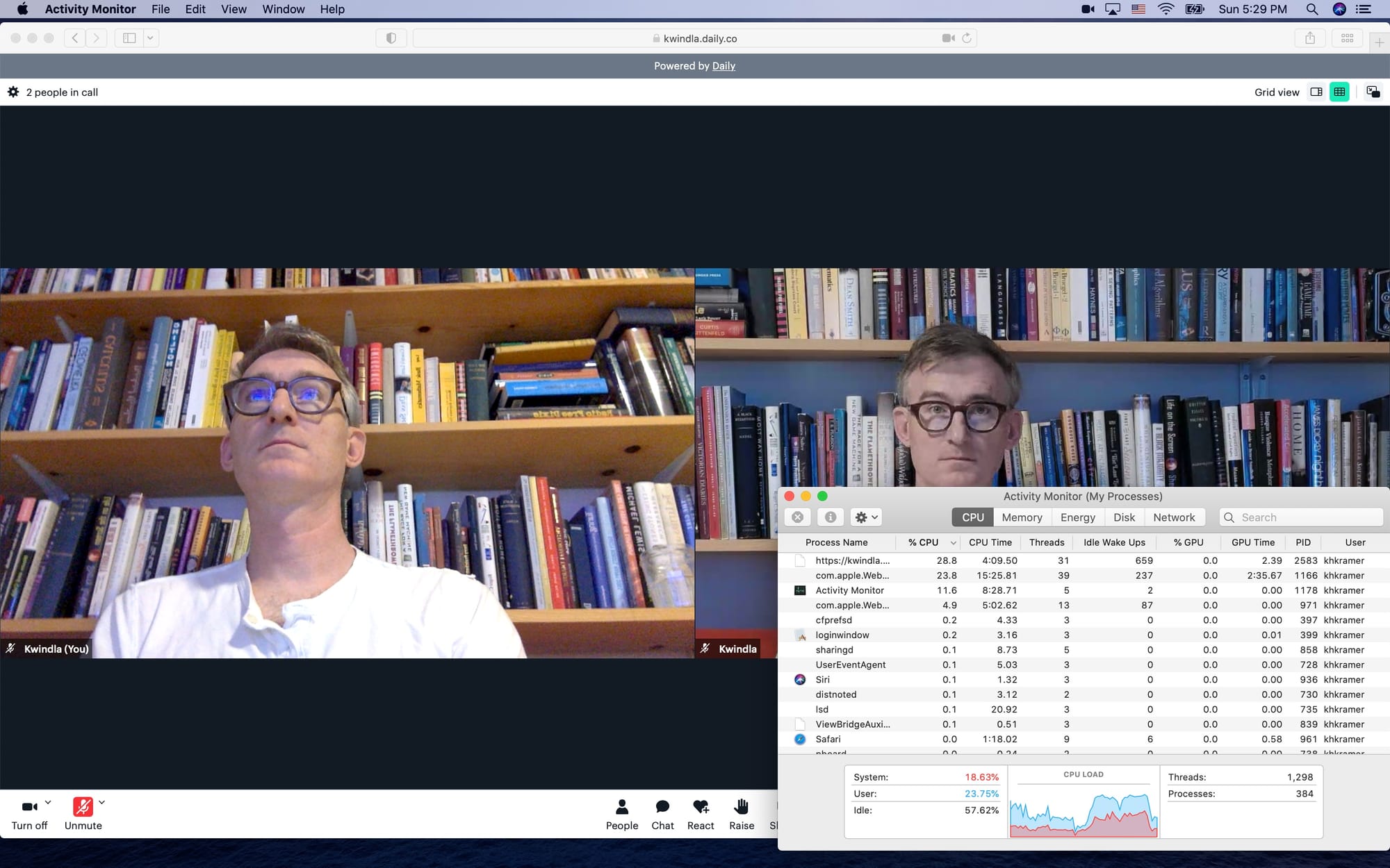 Here is the same 2-person test using Daily’s native WebRTC SDK. Configured to deliver the same video resolution as Zoom (360p), the Safari process uses 25-40% CPU. The video frame rate is consistent at 30fps. The machine feels responsive. Daily can also deliver 720p video on this machine, but CPU usage goes up to 80% and if other applications are running at the same time, the machine may start to lag. So we generally don’t recommend trying to send and receive 720p video on older devices.