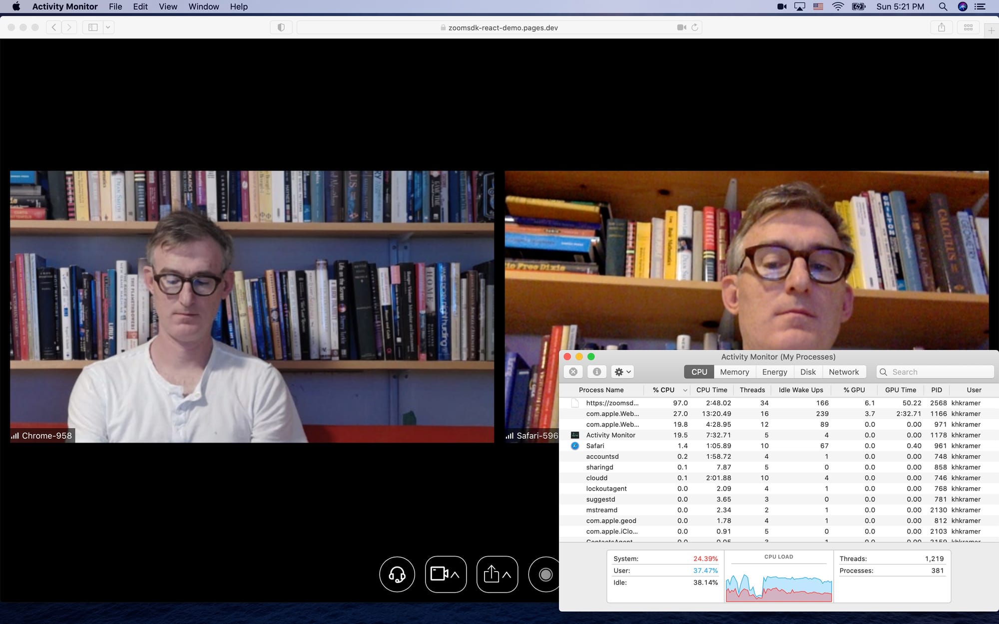 Here is a four-person call on the same machine. With the Zoom Web SDK, Safari CPU usage is 120%. The machine is very laggy. Audio and video are out of sync by several seconds. The Zoom sample application has gotten confused about the pixel resolution of the local video stream.